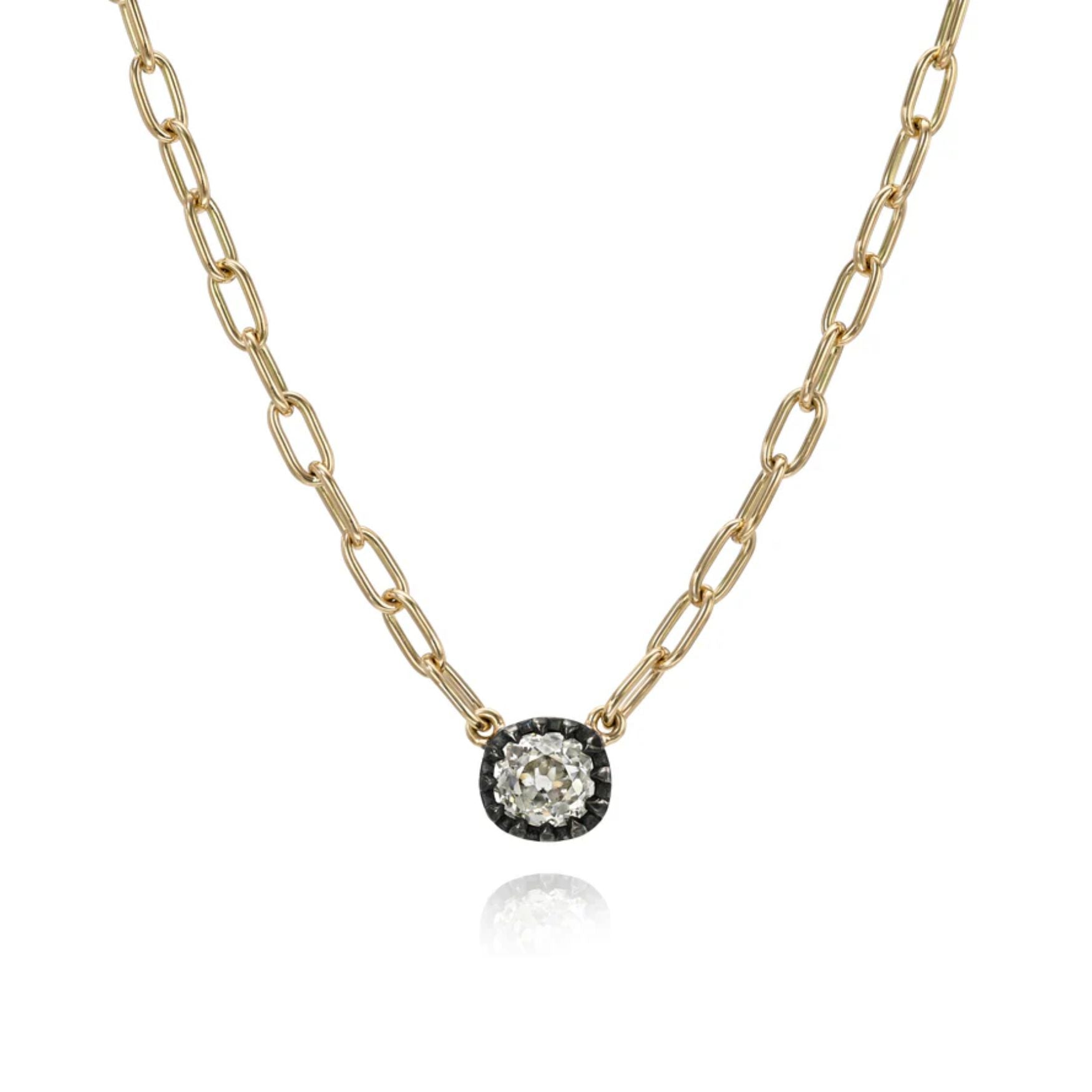 An antique cushion-cut diamond is bezel set in oxidized sterling silver and anchored by Single Stone’s signature 18k yellow gold Bond chain. A timeless piece, made to wear solo or layered your way.