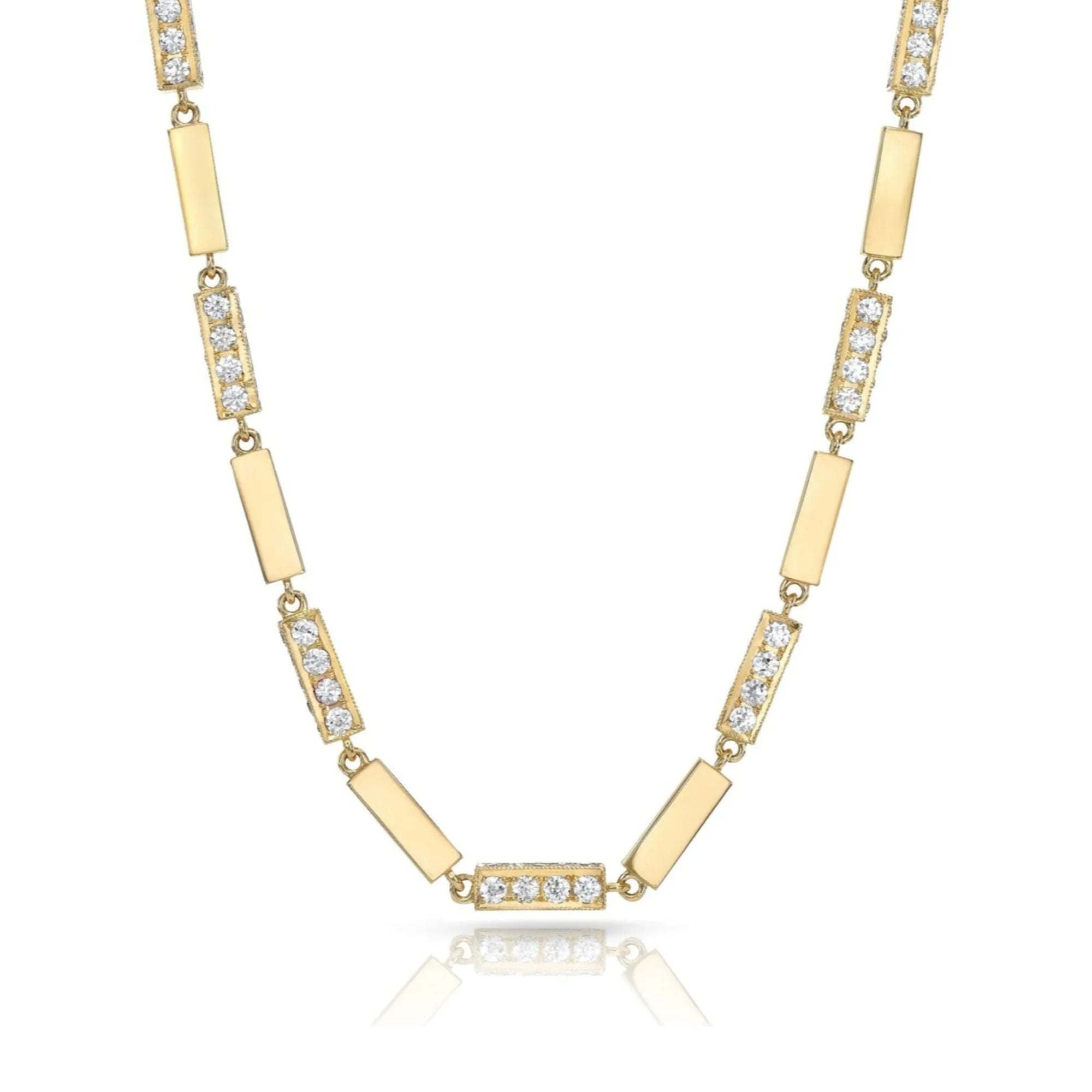 The ultimate statement in everyday luxury. Handcrafted in 18k yellow gold or a two‑tone mix of yellow gold and platinum, the Giana Necklace features a full‑bar design pavé‑set with approximately 9.00 ctw of vintage G‑H/VS old‑European cut diamonds for a bold, structured sparkle.