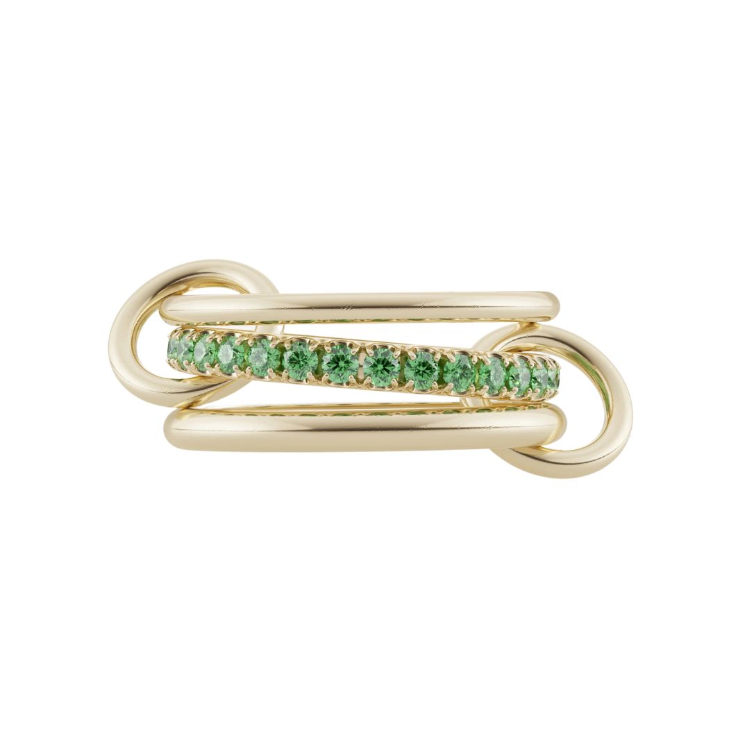 A colorful take on a classic silhouette, the Petunia Prism rings pair three multi-gauge bands, including a central band of pavé-set gemstones, with two matching orbiting connectors. Each Prism Petunia ring is individually handmade in Los Angeles.
