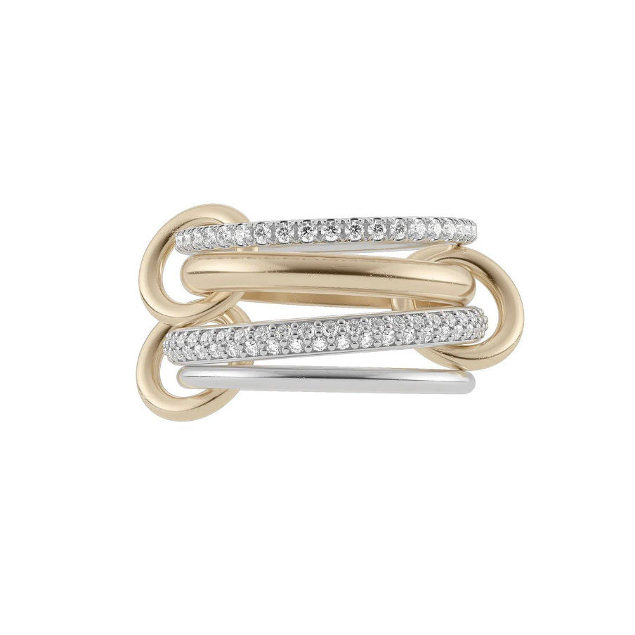 Like its namesake, the Vega constellation, the Vega emanates a stunning spectrum of light. The first band features brilliant, spectral white diamonds, U-set to expose every angle to light. Centered between two solid lustrous metal bands is the Vega's core: a 3.8mm band of micro pavé diamonds, set in contrasting prongs to create a stunning interplay of light and shadow. A network of three gold connectors unites the ring’s components. Arresting and imminently approachable, the Vega is a modular design that can be worn multiple ways. Each Vega is individually handmade in Los Angeles.