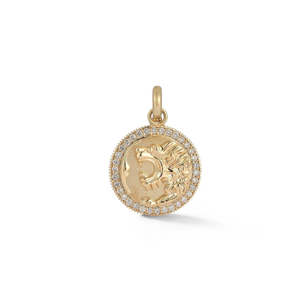 A nod to vintage charm with modern craftsmanship, this Storrow medallion features a regal lion accented by an olive branch—symbols of strength and peace. Framed with a diamond halo and cast in 14k yellow gold, it's a meaningful piece that layers beautifully or strands strong on its own.