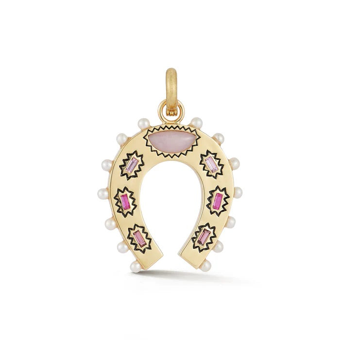Storrow 14K yellow gold pink gemstone & pearl Holly horseshoe charm (ruby, pink opal, pink tourmaline, pearl)