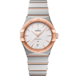 This 36 mm stainless steel and 18K Sedna™ gold model features a bezel engraved with Roman numerals, a silk-embossed creamy silvery dial and a date window at the 6 o'clock position. The hands, OMEGA logo, Constellation star and indexes are all in 18K Sedna™ gold.