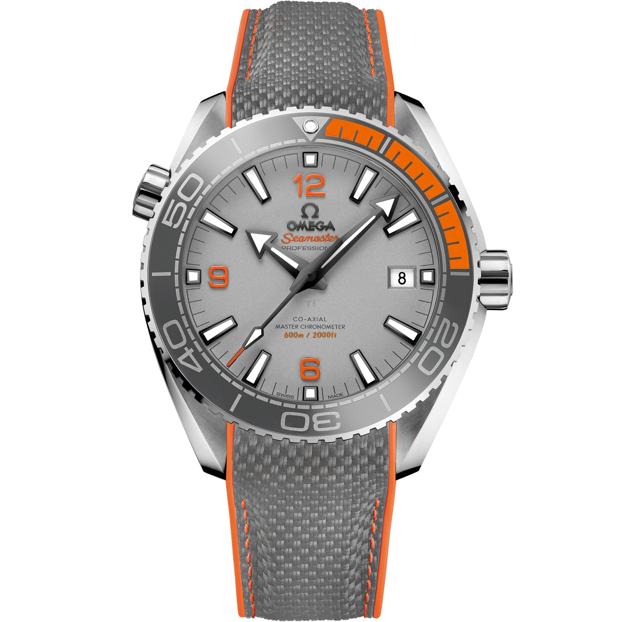 This model, with its scratch-resistant sapphire crystal, features a sand-blasted grade 5 titanium dial with Arabic numerals and a date window at the 3 o’clock position. Mounted on the 43.5 mm grade 5 titanium case, is the world's premiere grey silicon nitride ceramic bezel with orange rubber. The diving scale of the bezel is crafted with Liquidmetal™.