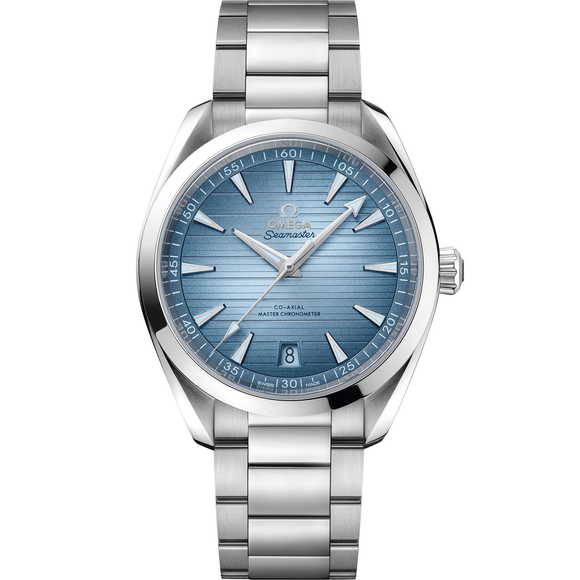 The teak pattern dial, in OMEGA’s own Summer Blue, is sun-brushed, PVD-treated, and varnished with a gradient finish to reflect the watch’s level of water resistance. It has rhodium-plated hands and indexes filled with a unique light blue Super-LumiNova and a matching blue date window indicator at 6 o’clock.
