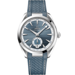 Presented on a structured blue rubber strap with grey stitching, this timepiece is powered by the OMEGA Co-Axial Master Chronometer calibre 8916, certified at the industry’s highest standard by the Swiss Federal Institute of Metrology (METAS).