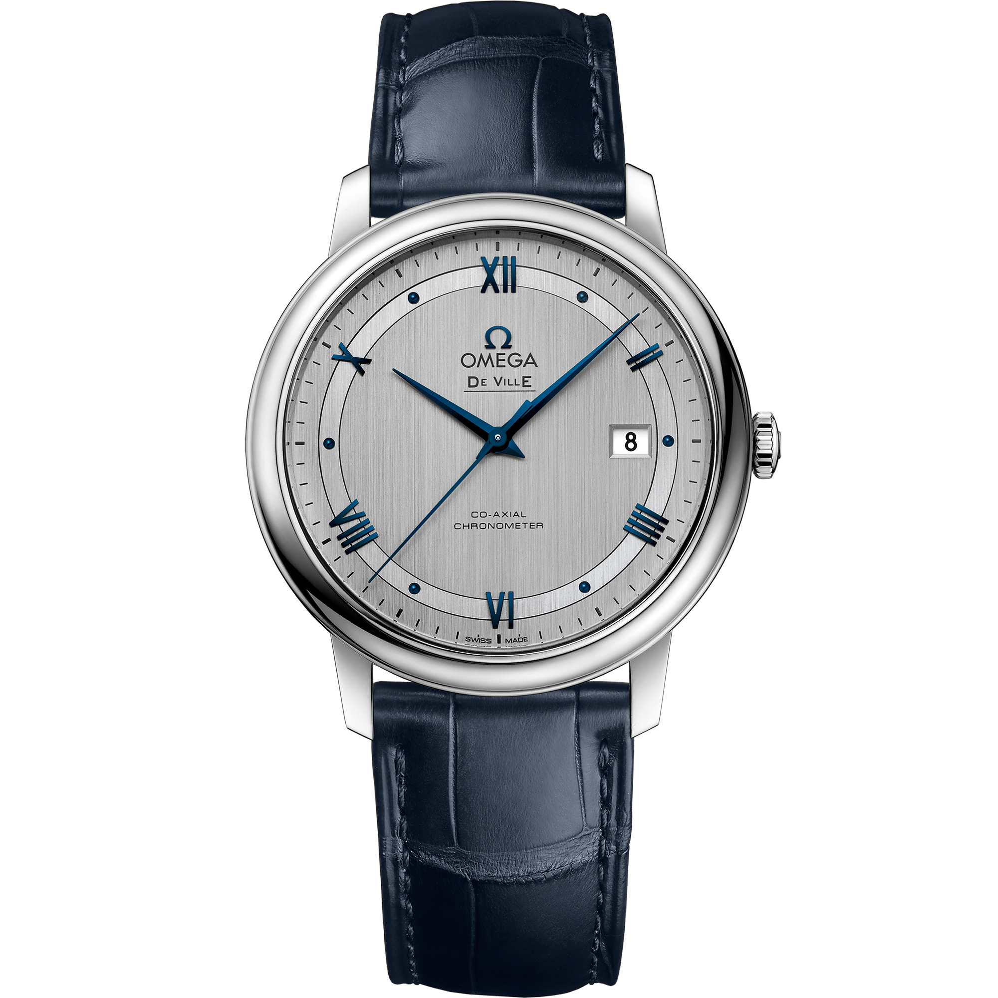 The 39.5 mm stainless steel case is presented on a blue leather strap. At the heart of this timepiece is the Co-Axial calibre 2500.