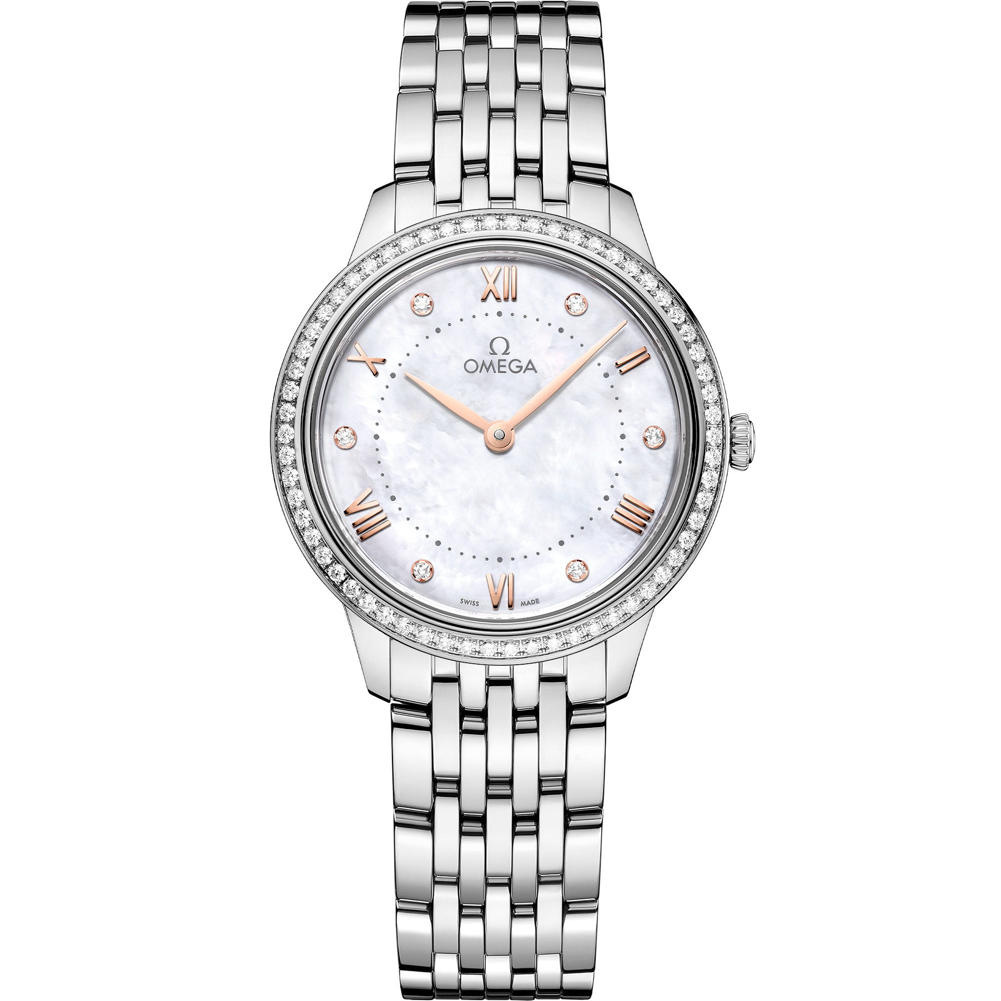 This watch is presented on a stainless steel bracelet and is driven by the OMEGA Quartz Calibre 4061, with a battery life of at least 48 months.
