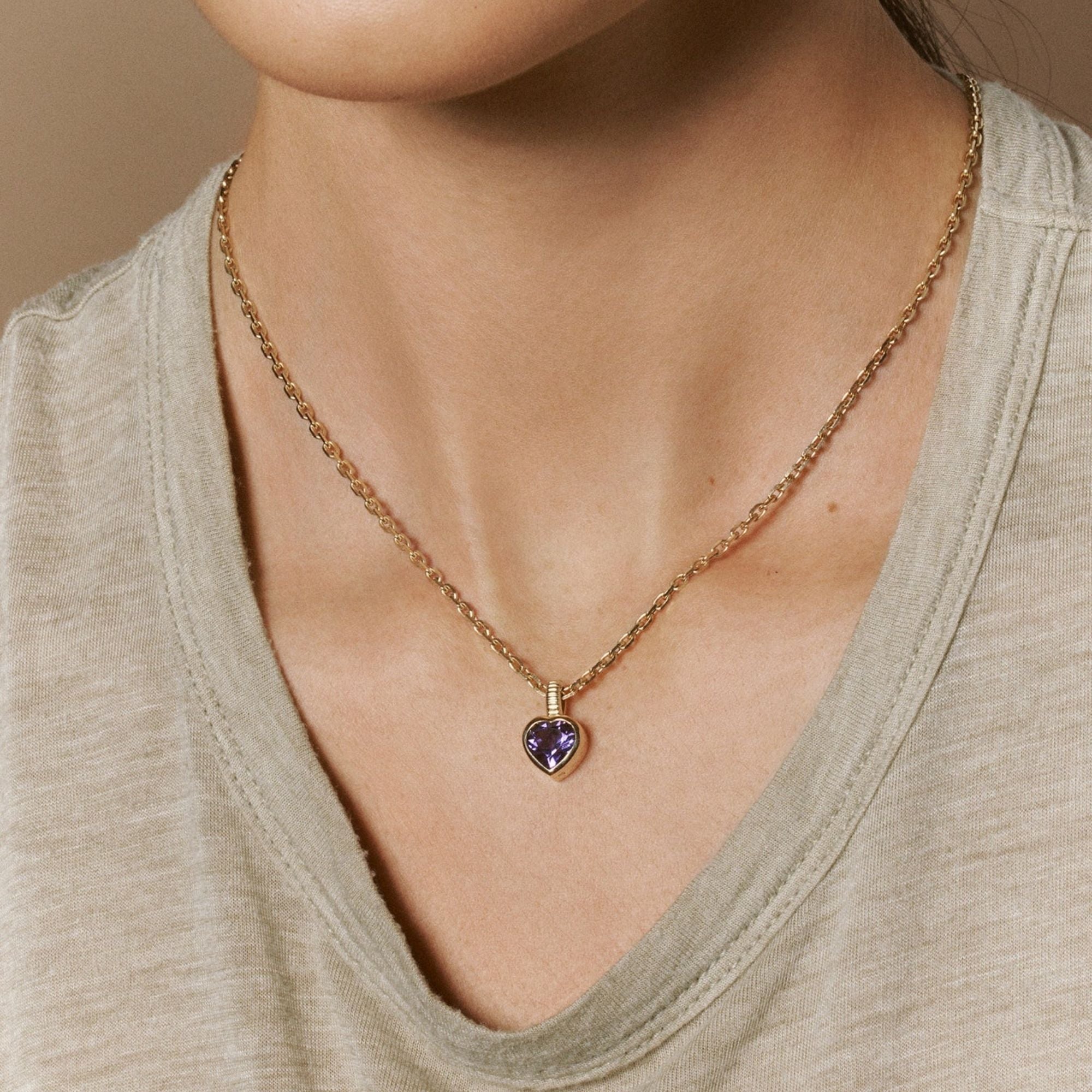 A heart-shaped amethyst charm bezel set in polished gold. The deep purple hue adds a subtle pop of a color in any charm stack. Amethyst is the February birthstone.