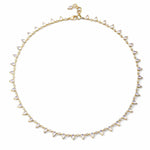 A delicate line of moonstone quartz pear drops accented with diamonds creates a soft, luminous presence. The silhouette sits beautifully along the neckline and brings an easy, polished glow to any look.