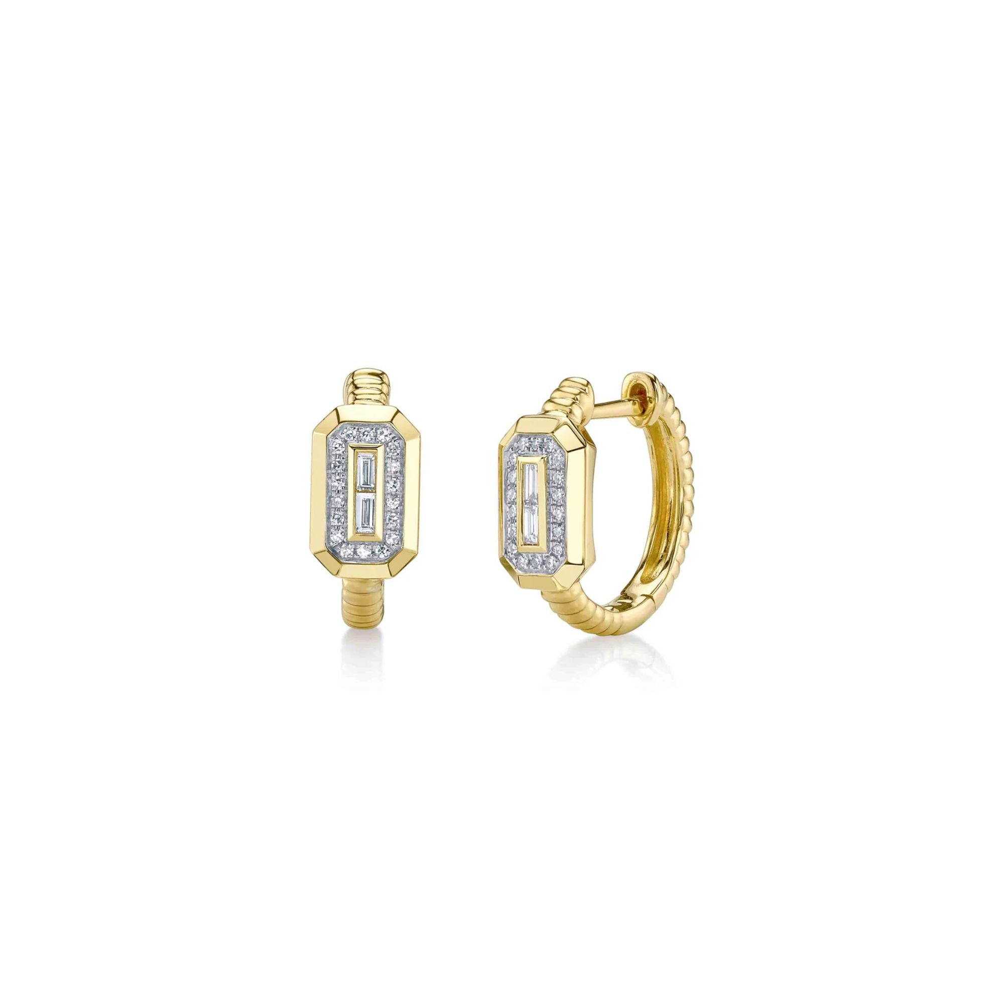 A ribbed gold hoop finished with two baguettes in the center with a pavé diamond surround. A structured, slightly bold take on a classic huggie earring.