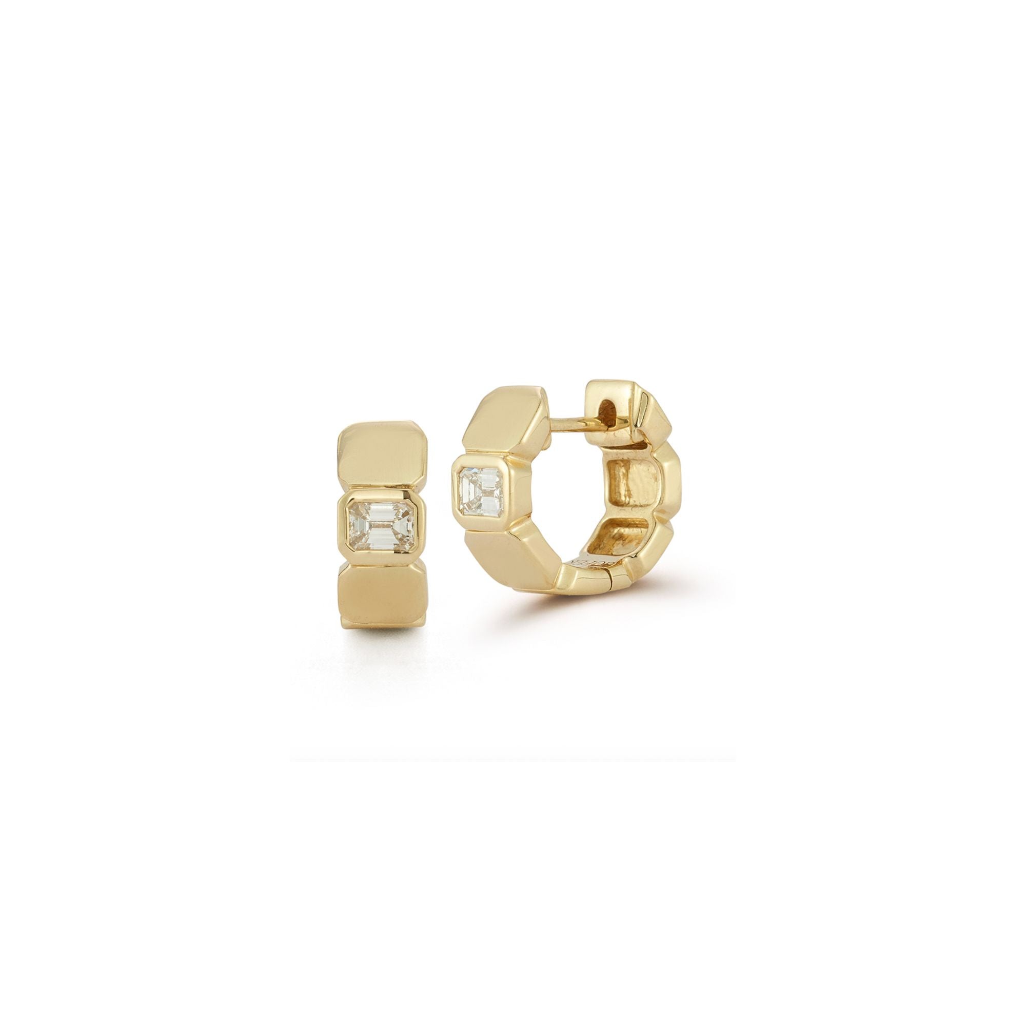 Bezel-set emerald-cut diamonds, arranged east-west for a clean, modern take on the classic huggie.
