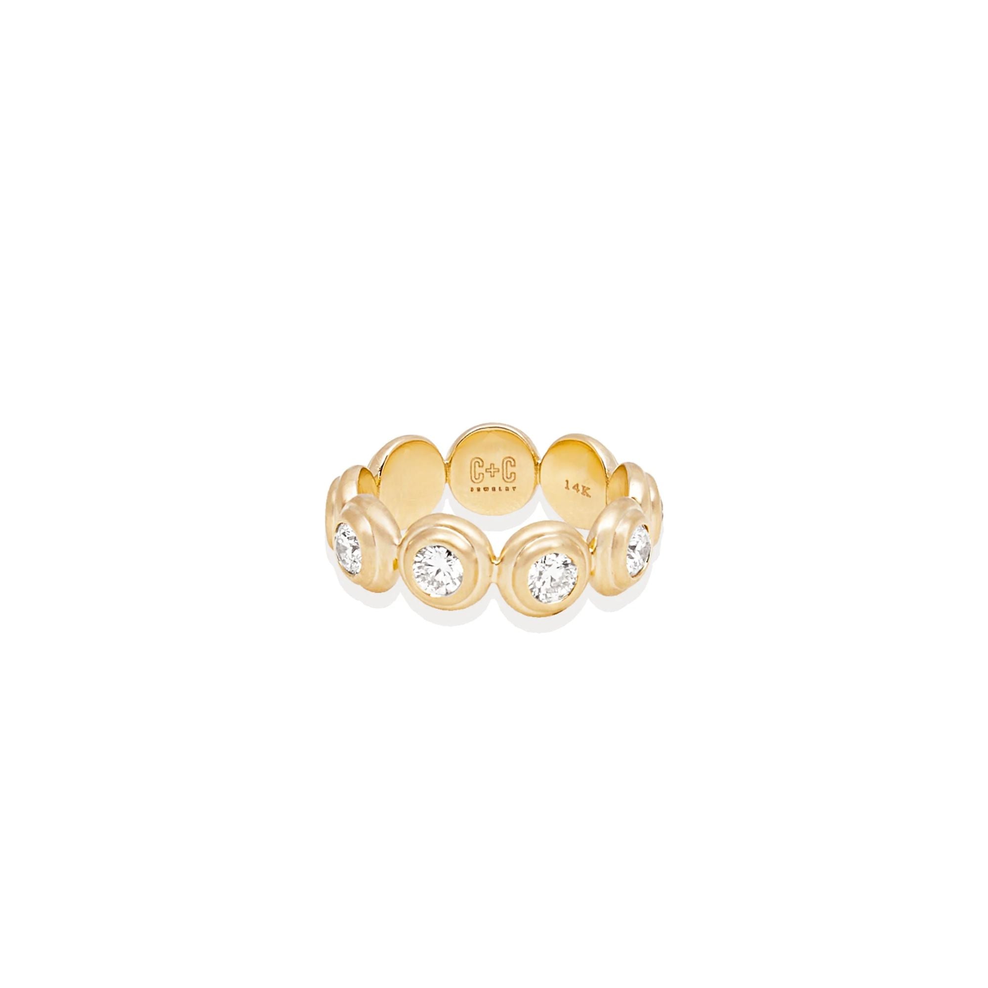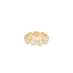 The Extra Large Evolve Stacking Ring features a repeating concentric circle design that reflects the ongoing journey of growth and transformation. Each 14k gold circle is set with a vibrant diamond at its center, creating a band that feels both textural and luminous. Thoughtfully crafted and visually distinctive, it brings symbolic meaning and refined style to any stack.