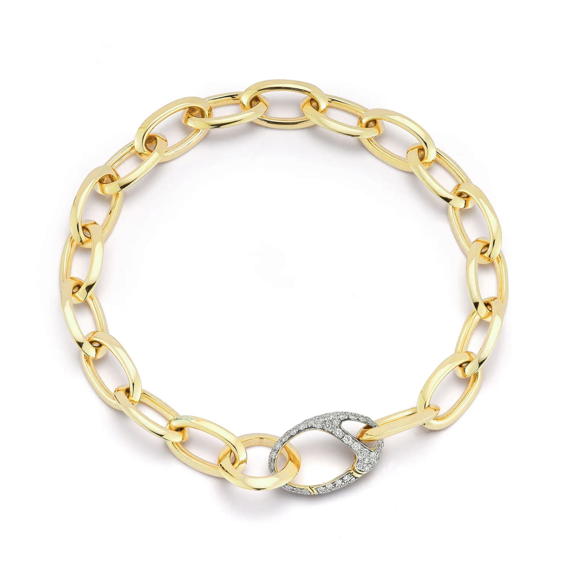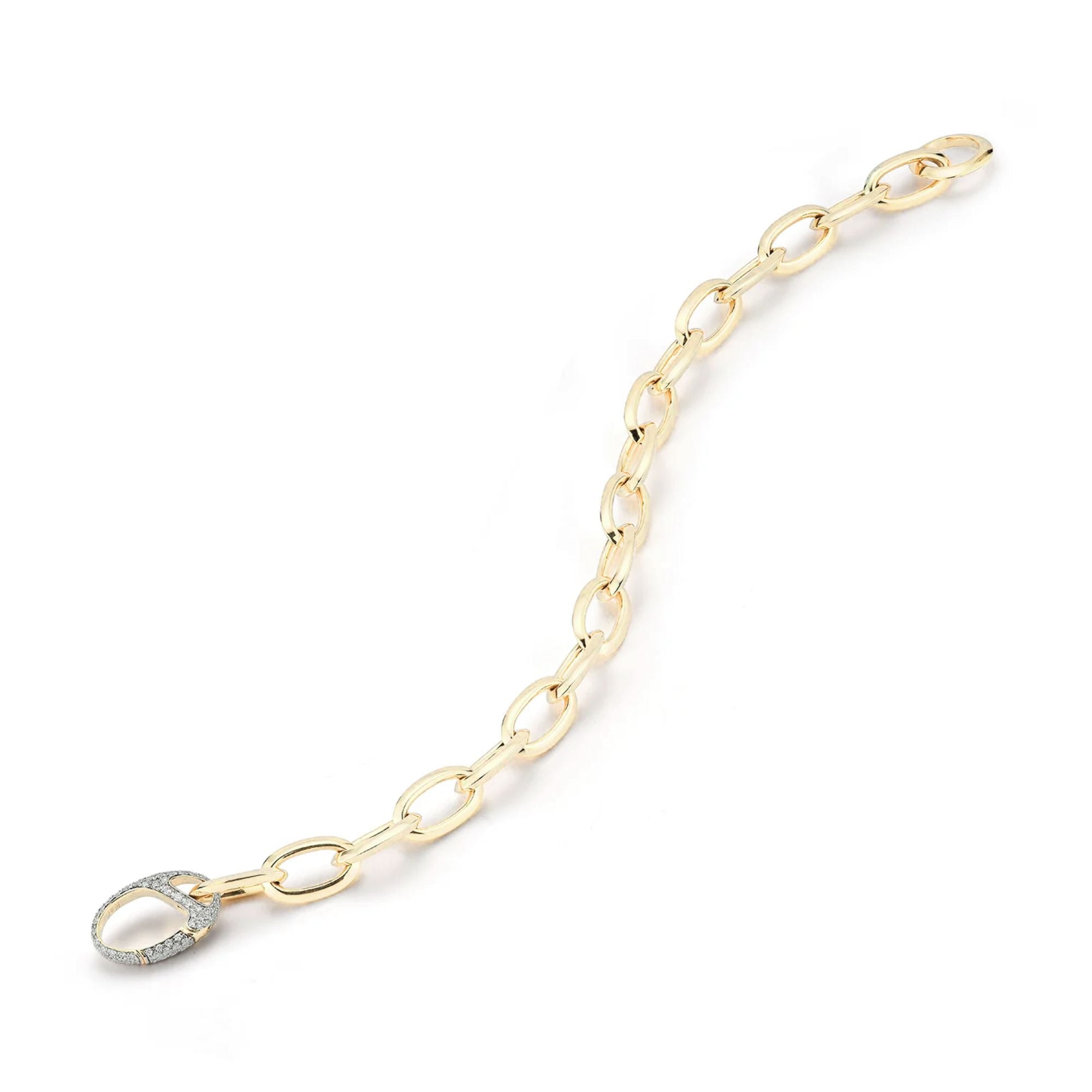 A modern classic in chain link form, this Saxon bracelet is crafted in solid 18k yellow gold with bold, sculptural links and a refined diamond‑set oval clasp that brings understated sparkle to every angle. The substantial silhouette feels both architectural and wearable, designed to anchor your jewelry rotation whether worn alone or paired with other favorites.