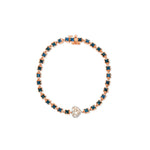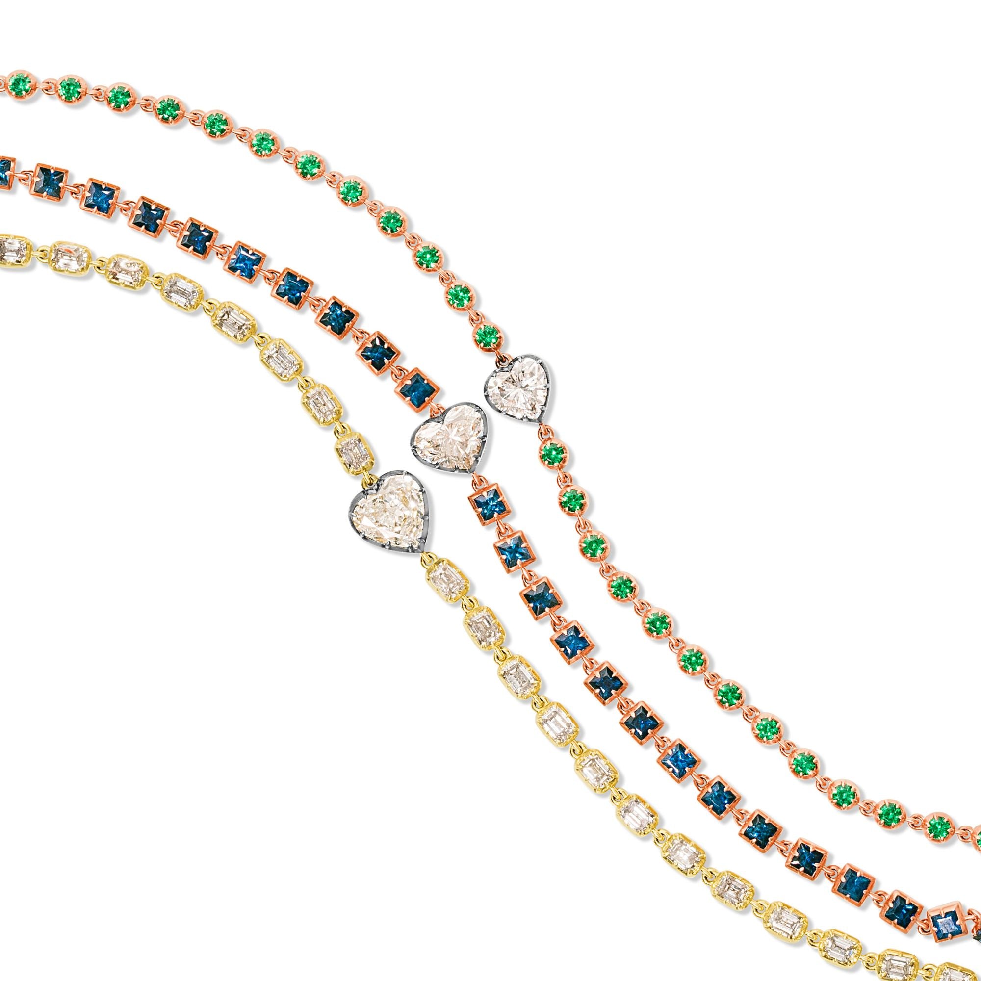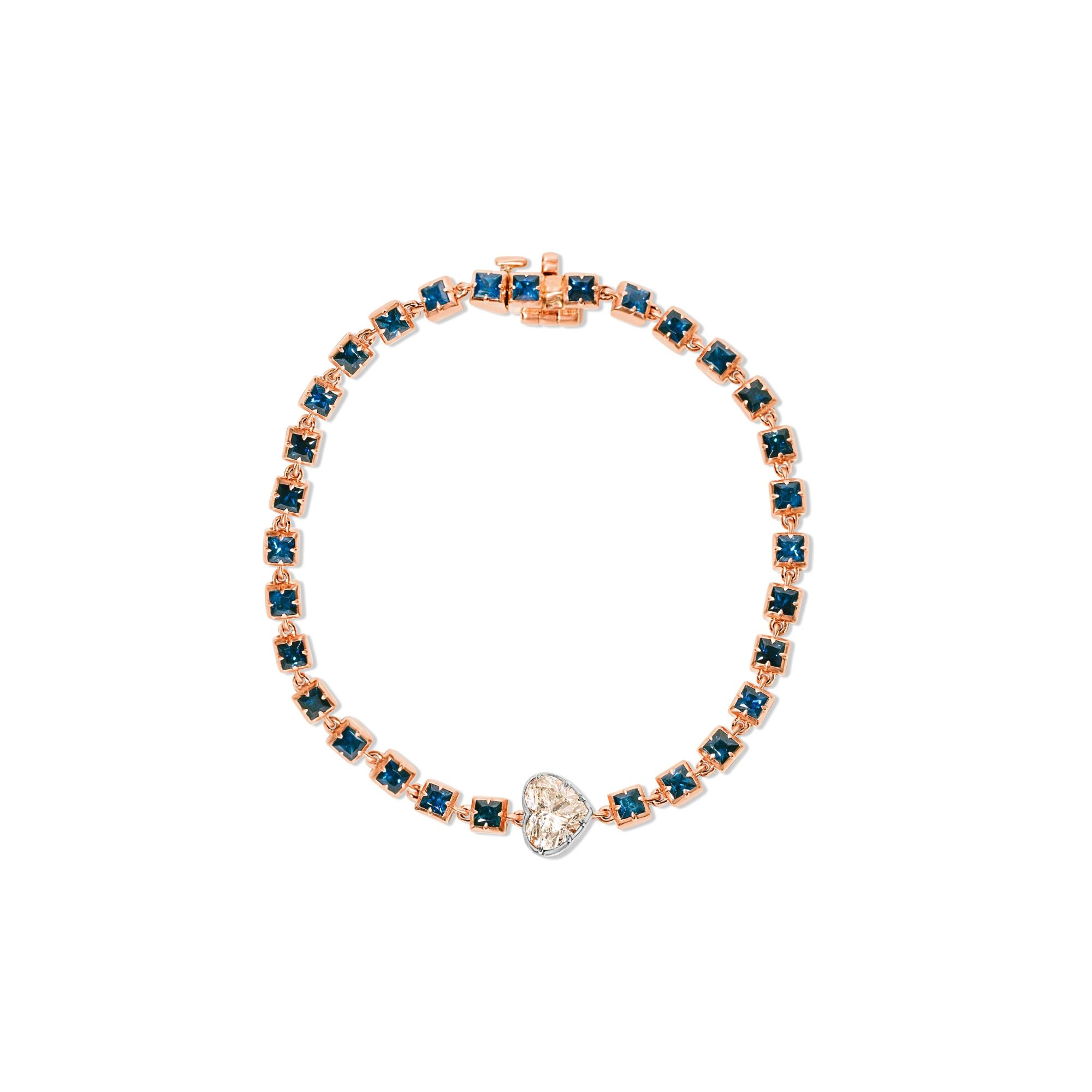Classic meets unexpected. A continuous line of deep blue sapphires encircles the wrist, leading to a single hear-shaped diamond at the center.