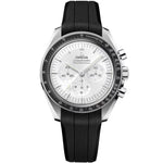 Certified Pre-Owned 2025 Omega Speedmaster Moonwatch 18k Canopus white gold silver dial black rubber strap Style 31063425002001 Serial #84445501