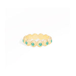 The repeating concentric circle design forming the Evolve Stacking Ring symbolizes the cyclical process of constantly evolving to be our best selves. Each 14k gold concentric circle component centers on a vibrant emerald, creating a uniquely designed band that is both, textural and radiant.