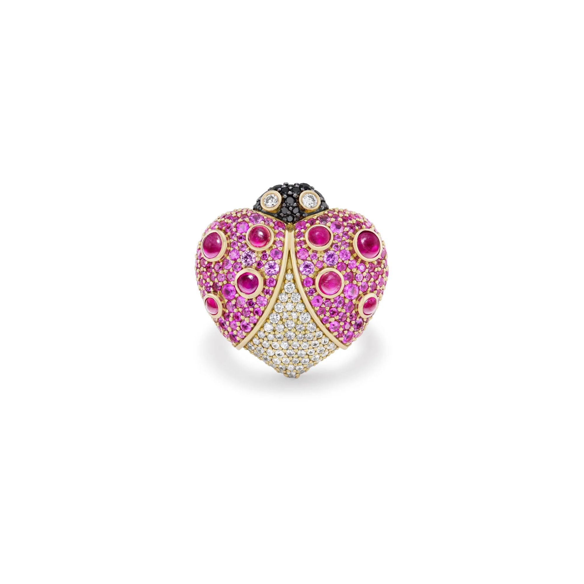 A playful heart-shaped ladybug ring in 18k yellow gold pops with pink sapphires at the center, surrounded by sparkling white diamonds, rubies, black diamonds, and ruby cabochons. Bold, joyful, and made to mix, it’s perfect for stacking or stealing the spotlight on its own.