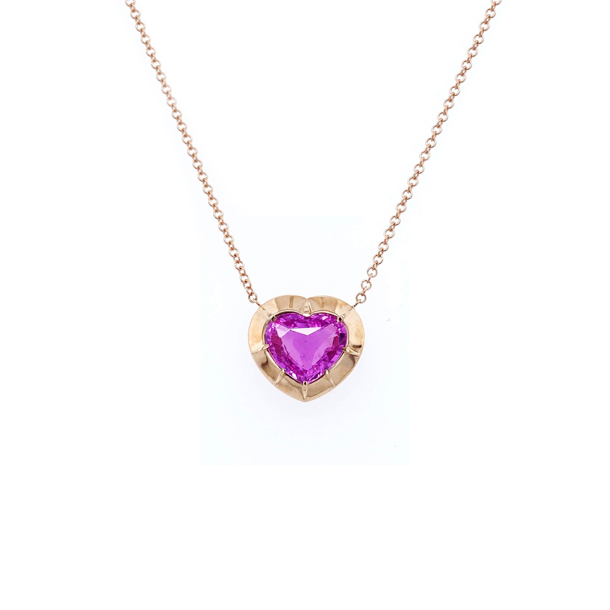 It's not the kind of heart you outgrow. This pink sapphire catches the light in a way that feels bold but effortless—set in solid 18k rose gold for a look that's clean, modern, and made to last.