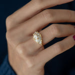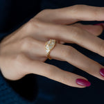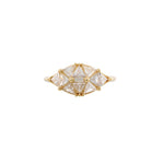 Sculptural and striking, the Reflective Dome Ring is a modern take on timeless elegance. At its center sits a baguette-cut diamond, framed by ten triangle-cut diamonds in a precise, origami-inspired composition. Designed to catch the light from every angle, this piece offers brilliant sparkle and architectural beauty.