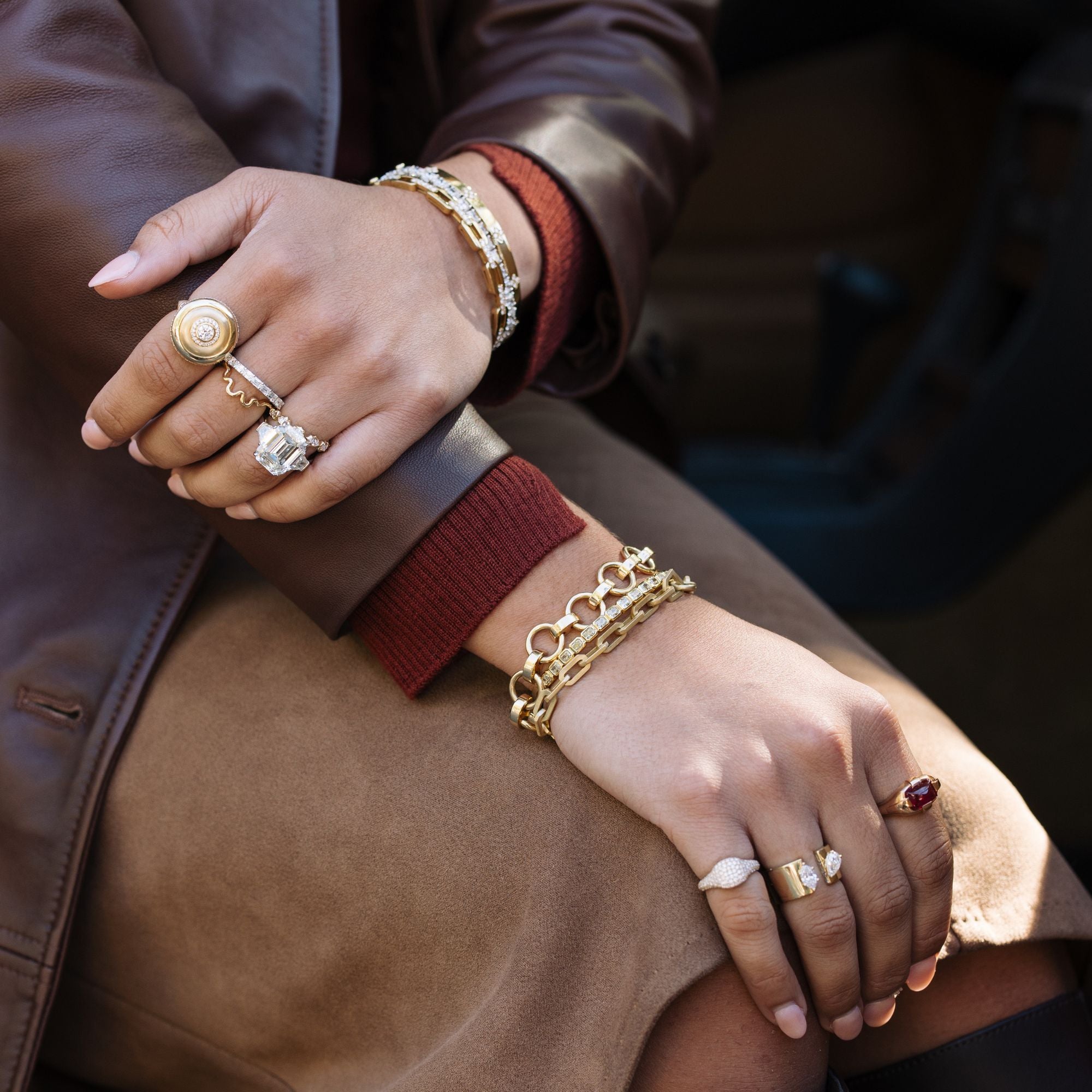 A smooth, saturated ruby set in 18k rose gold, this ring adds a sculptural element and a vibrant pop of color to your ring stack.