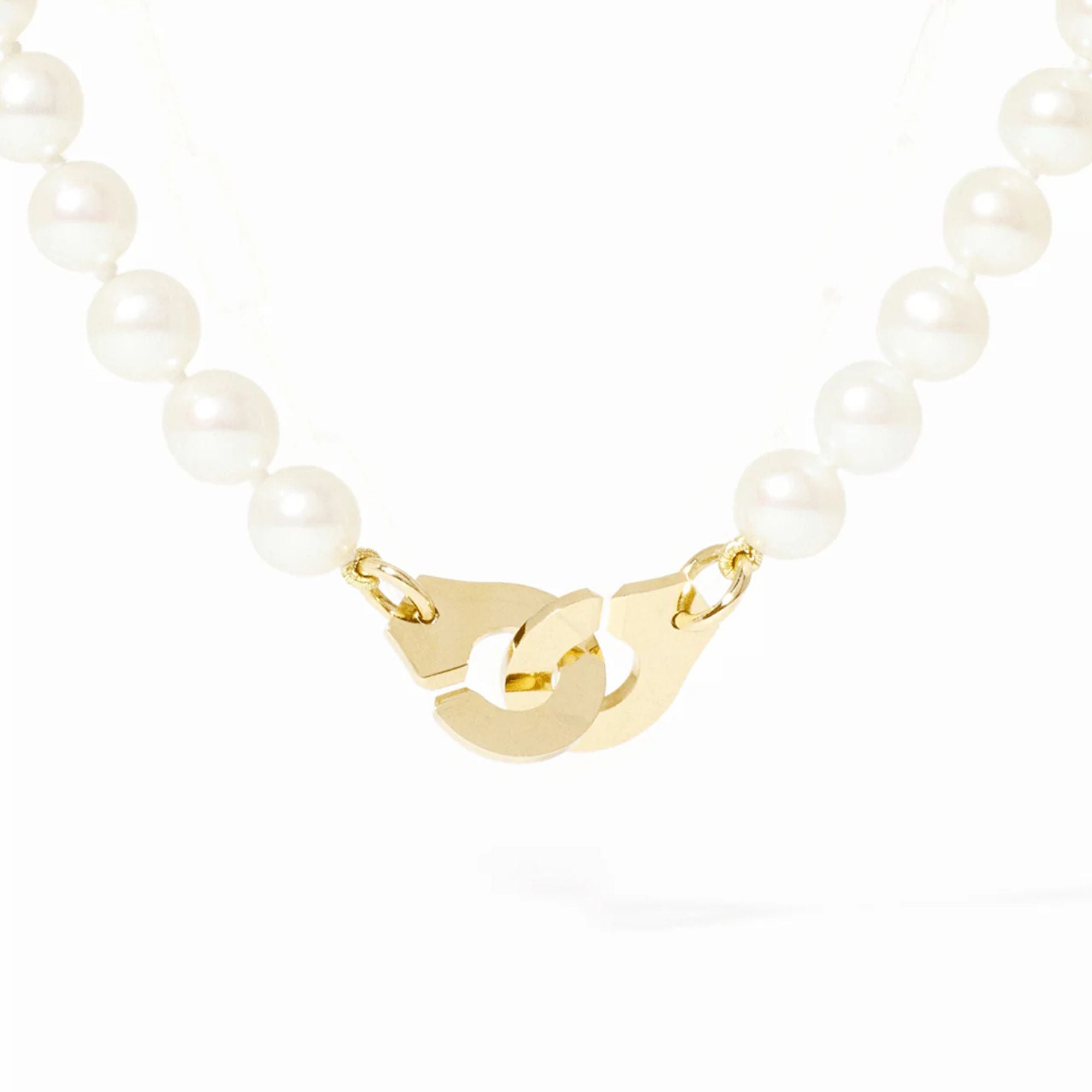 The iconic Menottes dinh van design in yellow gold is enhanced by a strand of freshwater pearls.