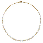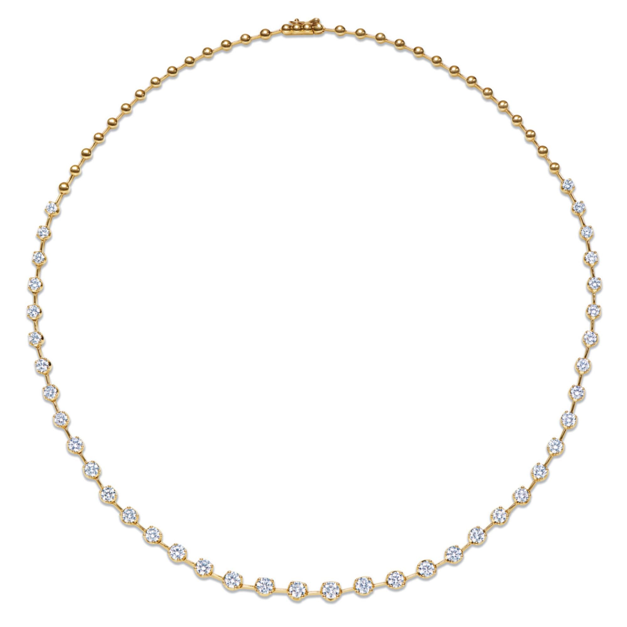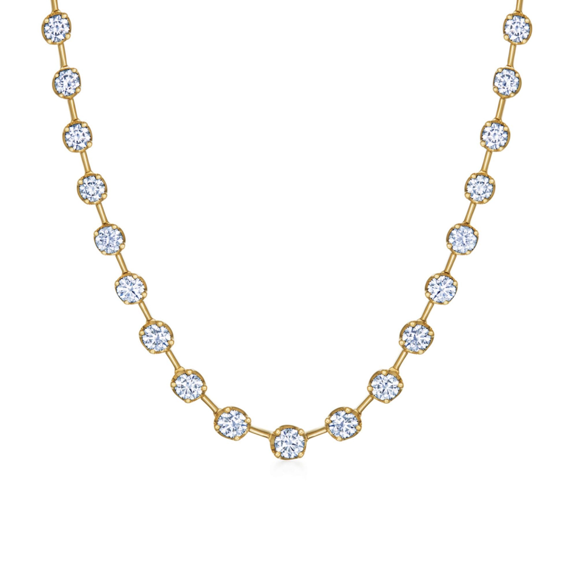 Diamonds orbit the neckline like a miniature twinkling galaxy. This timeless design dazzles with exquisite round brilliant diamonds, each cut to peerless Kwiat standards. Set along a strand of delicate 18K yellow gold, the stones seem to float effortlessly against the skin.