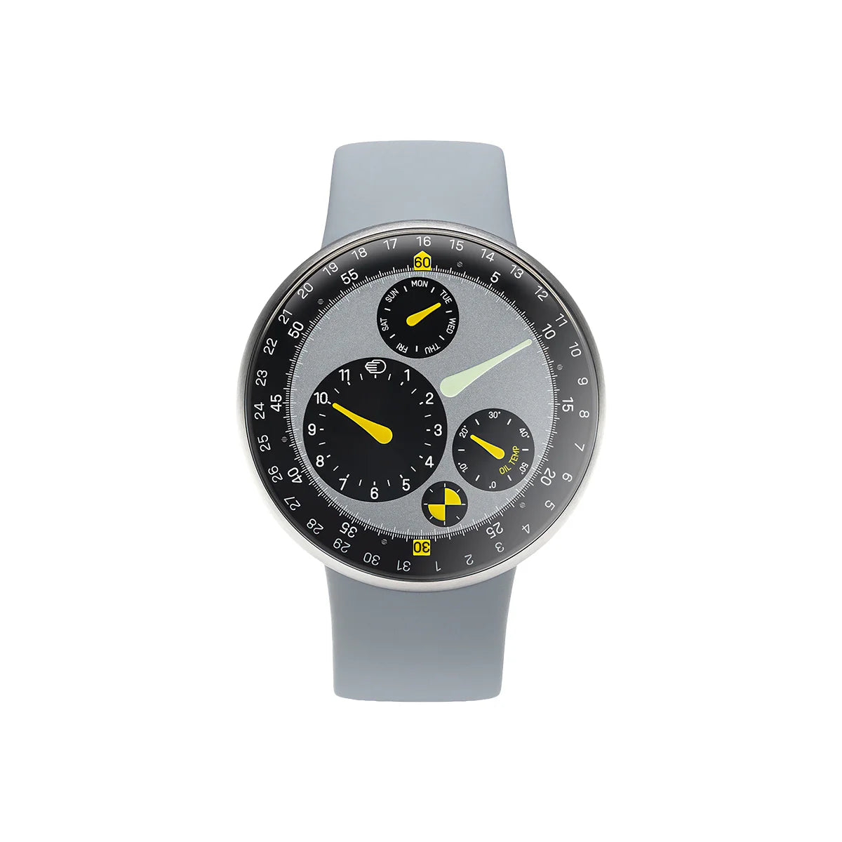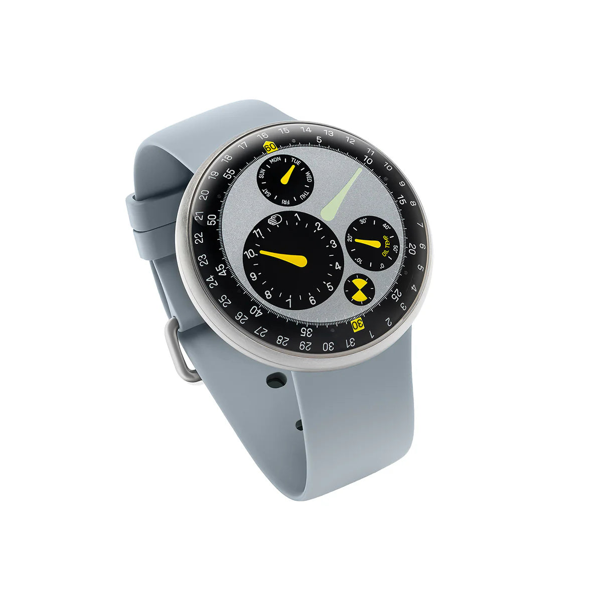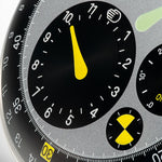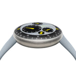 - Convex Grade 5 Titanium dial (125mm radius) with four eccentric biaxial satellites inclined at 3° (hours), 4.75° (thermal gauge and day) and 6.25° (runner)